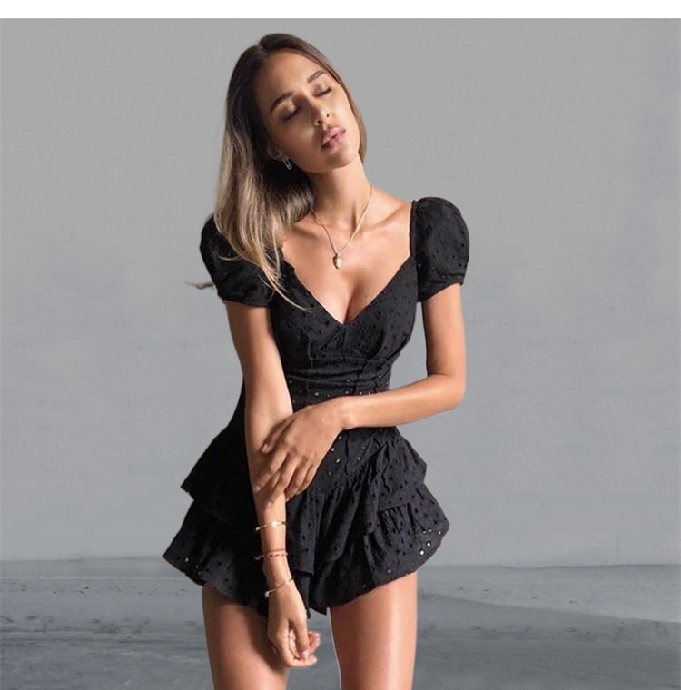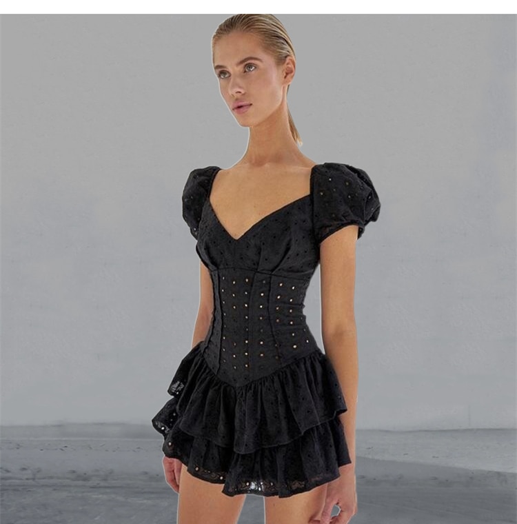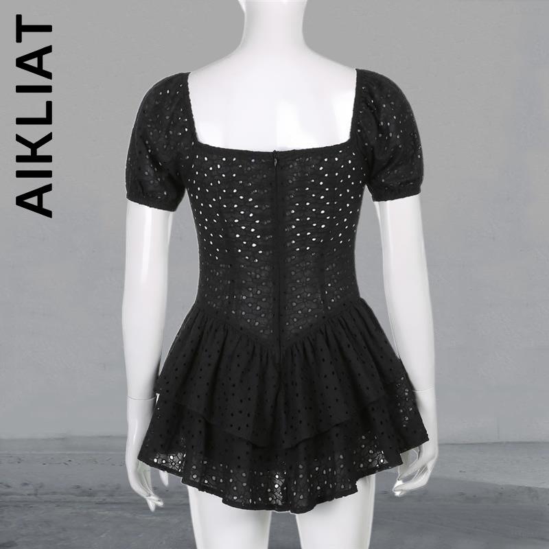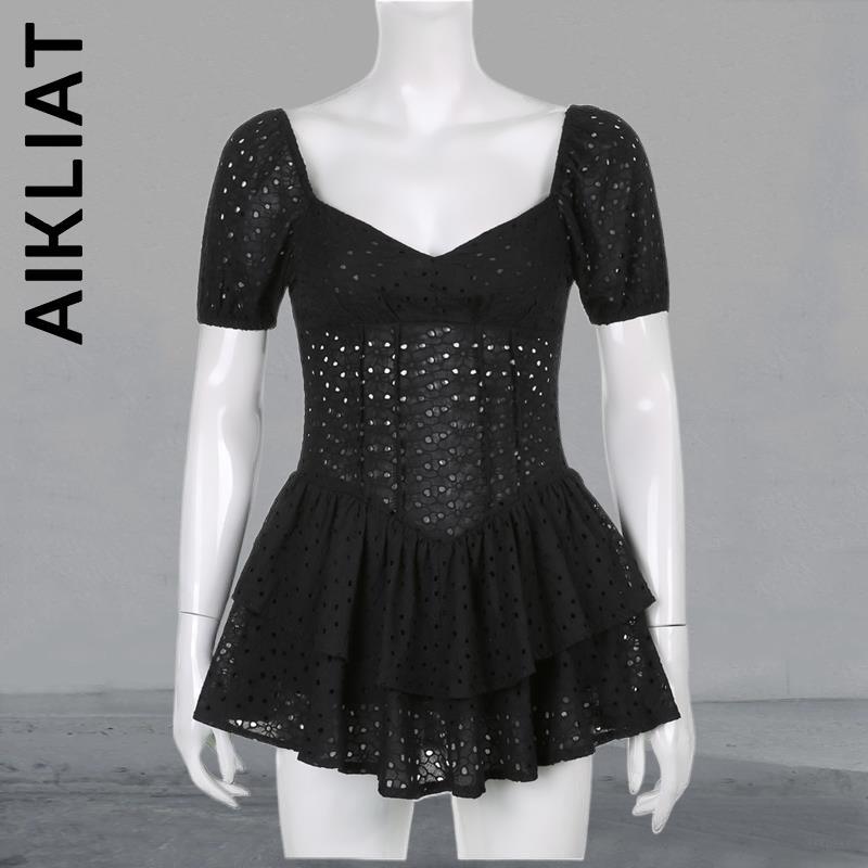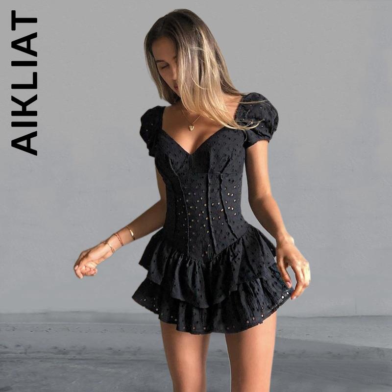 Aikliat New Dress Women Slim Robe Puff Sleeve Hollow Out Chic Black Summer Dress Temperament Girl Vestidos Female Clothing